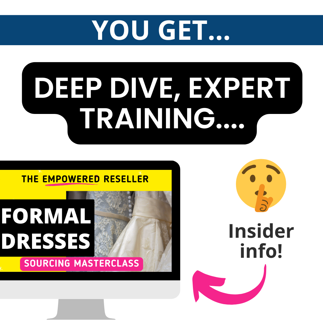 Inside the Formal Dresses Sourcing Box, you’ll uncover the exact silhouettes, fabrics, details, and phrases that help resellers turn $25 thrift finds into $125–$200 sales — using brands and pieces anyone can find.