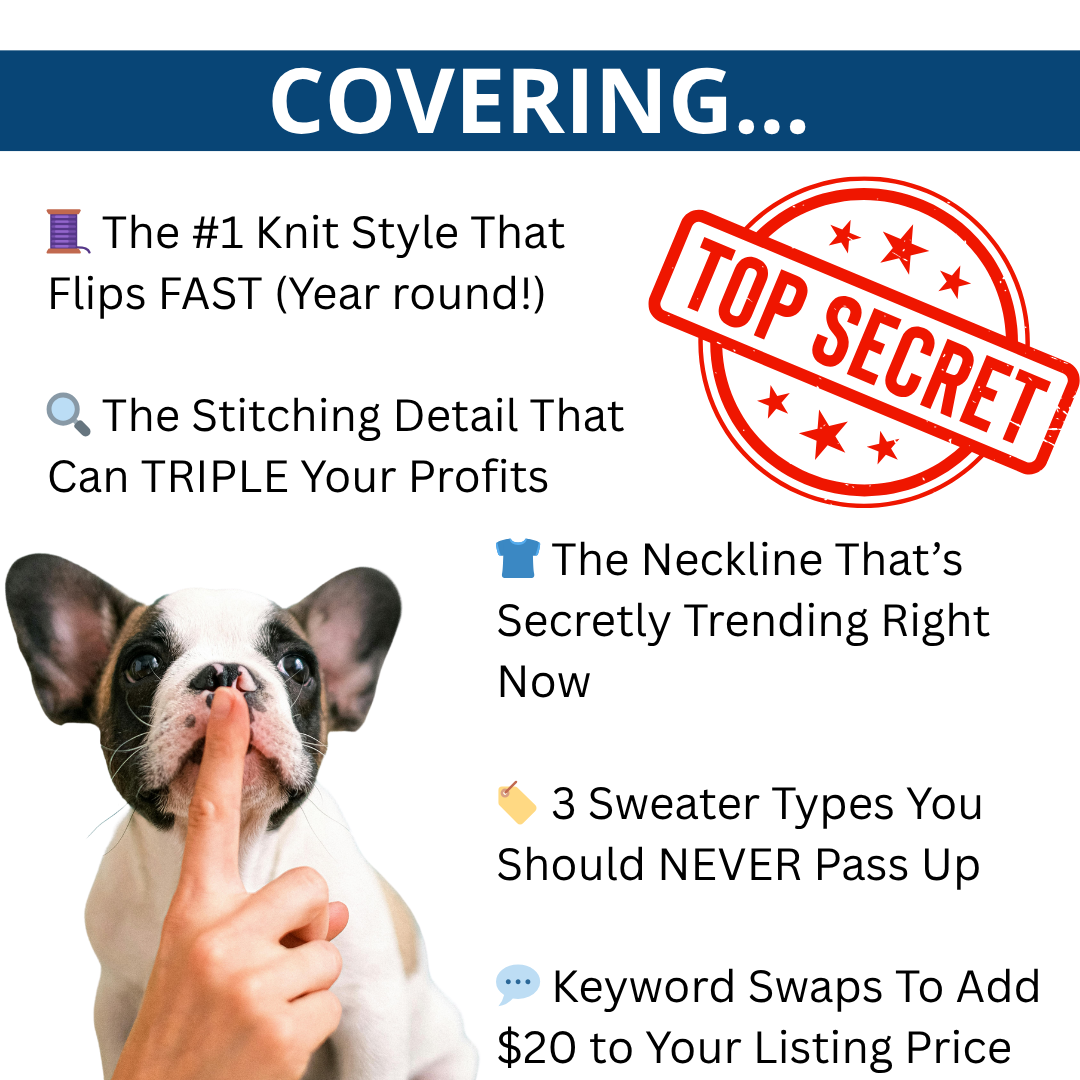 We're talking undervalued (low value, unsearchable brands, even unbranded) items, profitable keywords, secret stitch details and styles that fly under the radar (and sell for $$$).